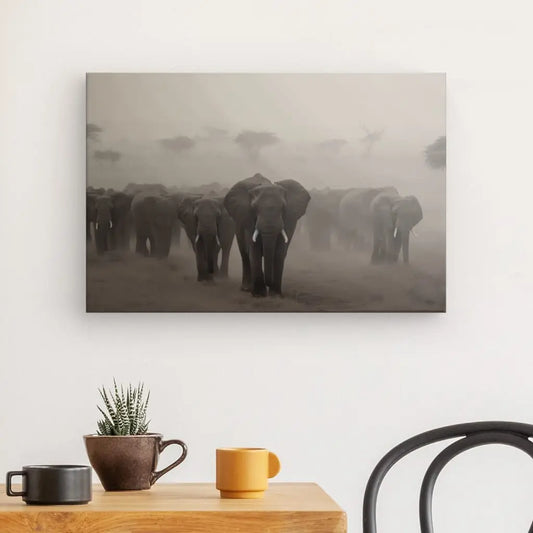 Tableau Troupeau Famille Elephants Savane Noir et Blanc