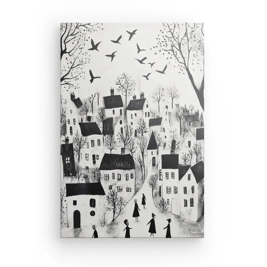 Tableau Village Art Naïf Dessin Enfant Monochrome